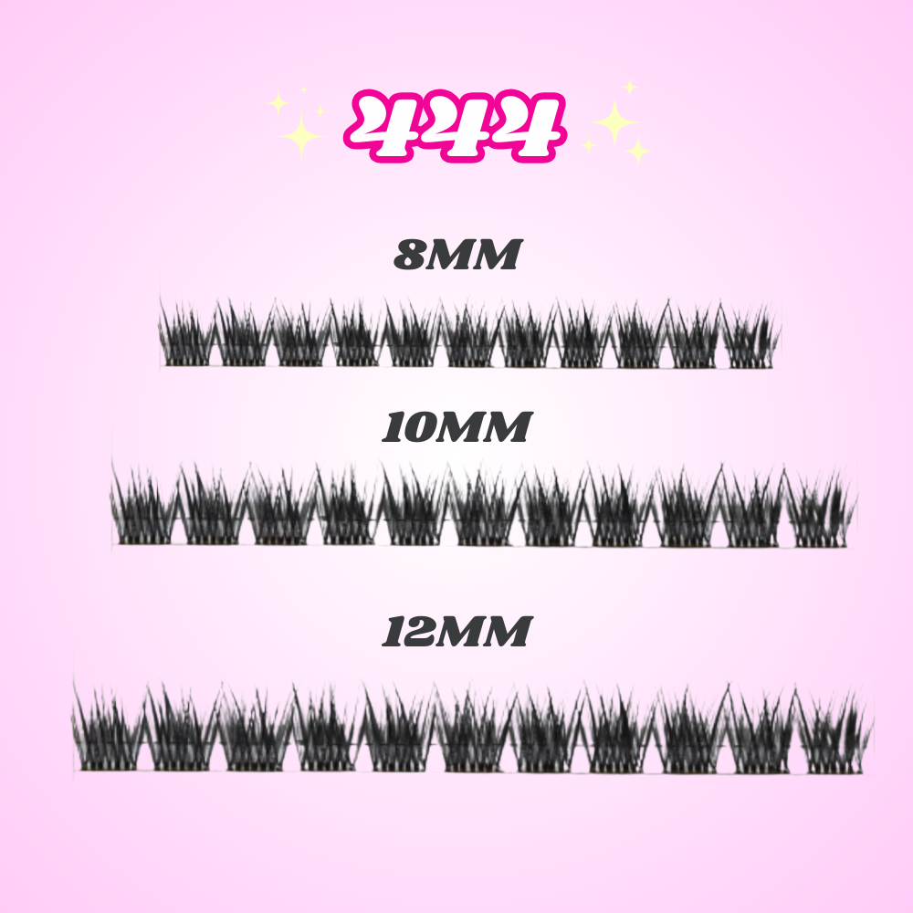 444: Achieve a soft, lifted effect with style 444, featuring fine, multi-layered fibers that blend seamlessly with your own lashes. Designed with three adjustable lengths, these lashes give a refined, polished look without overpowering your natural charm.